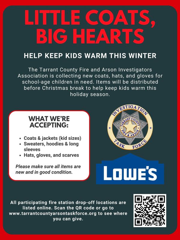 This holiday season, the Tarrant County Fire and Arson Investigators Association is proud to announce the launch of Little Coats, Big Hearts, a community program dedicated to keeping local children warm during the winter months. Through this initiative, we’ll be collecting new coats, hats, and gloves for school-aged children in need throughout Tarrant County. Every donation helps make a difference, providing comfort and warmth to kids who might otherwise go without.