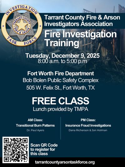 Free fire investigation training class for Texas Fire/Arson Investigators. Morning session- Transitional Burn Patterns taught by Dr. Paul Ayers. Afternoon session- Insurance Fraud Investigations taught by Dana Richerson and Jon Holman.